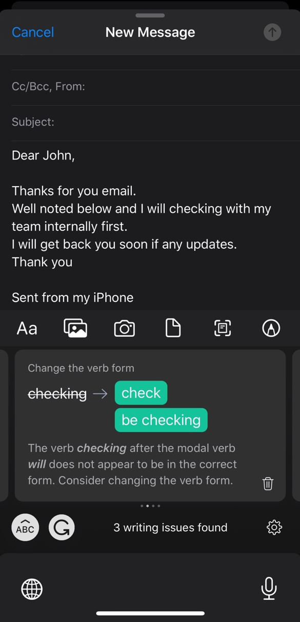 외부에 있을 때는 아이폰을 이용하여 이메일을 보내기도 하고 친구들과 영어로 메신저 앱으로 대화를 할 때 그래머리 grammarly를 자주 사용하고 있습니다. 스마트폰의 작은 자판 때문에 PC를 사용할 때보다 오타도 많이 나고 문법도 덜 신경 쓰게 되는데, 하나하나 수정하지 않고 그래머리 grammarly에서 자동 측정 후 전달하는 교정 코멘트에 따라 손쉽게 수정할 수 있습니다.