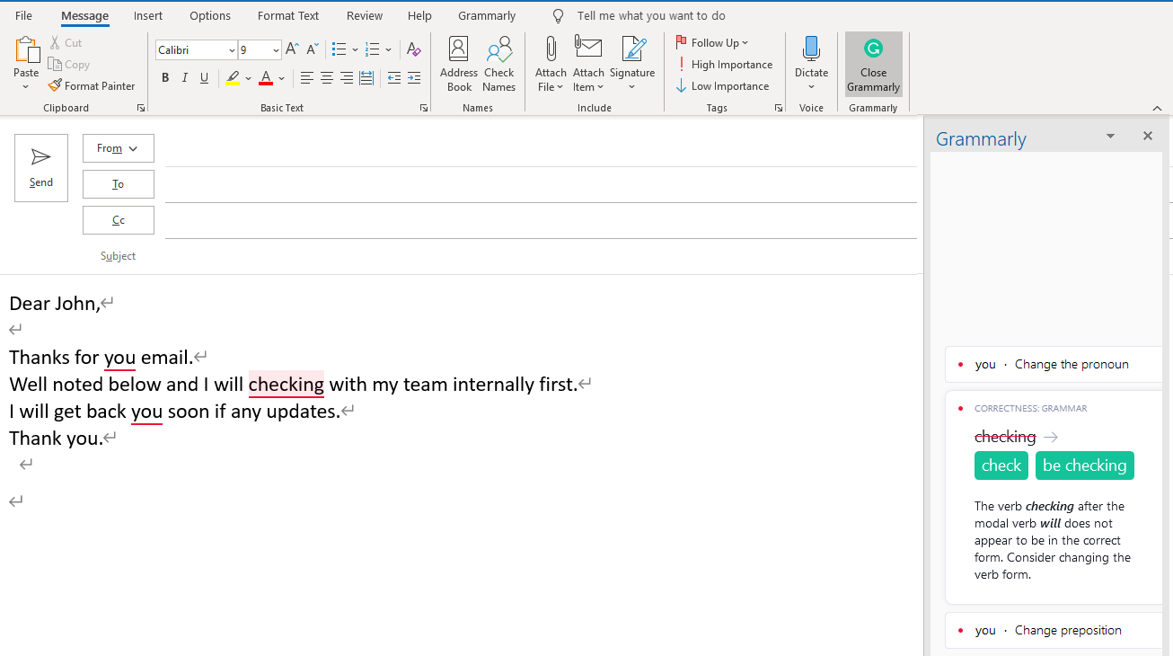3. 아웃룩 프로그램 내에서 이메일을 작성하는 경우 아웃룩 내에서 위와 같이 문법 및 철자 검사를 바로 확인할 수 있습니다.